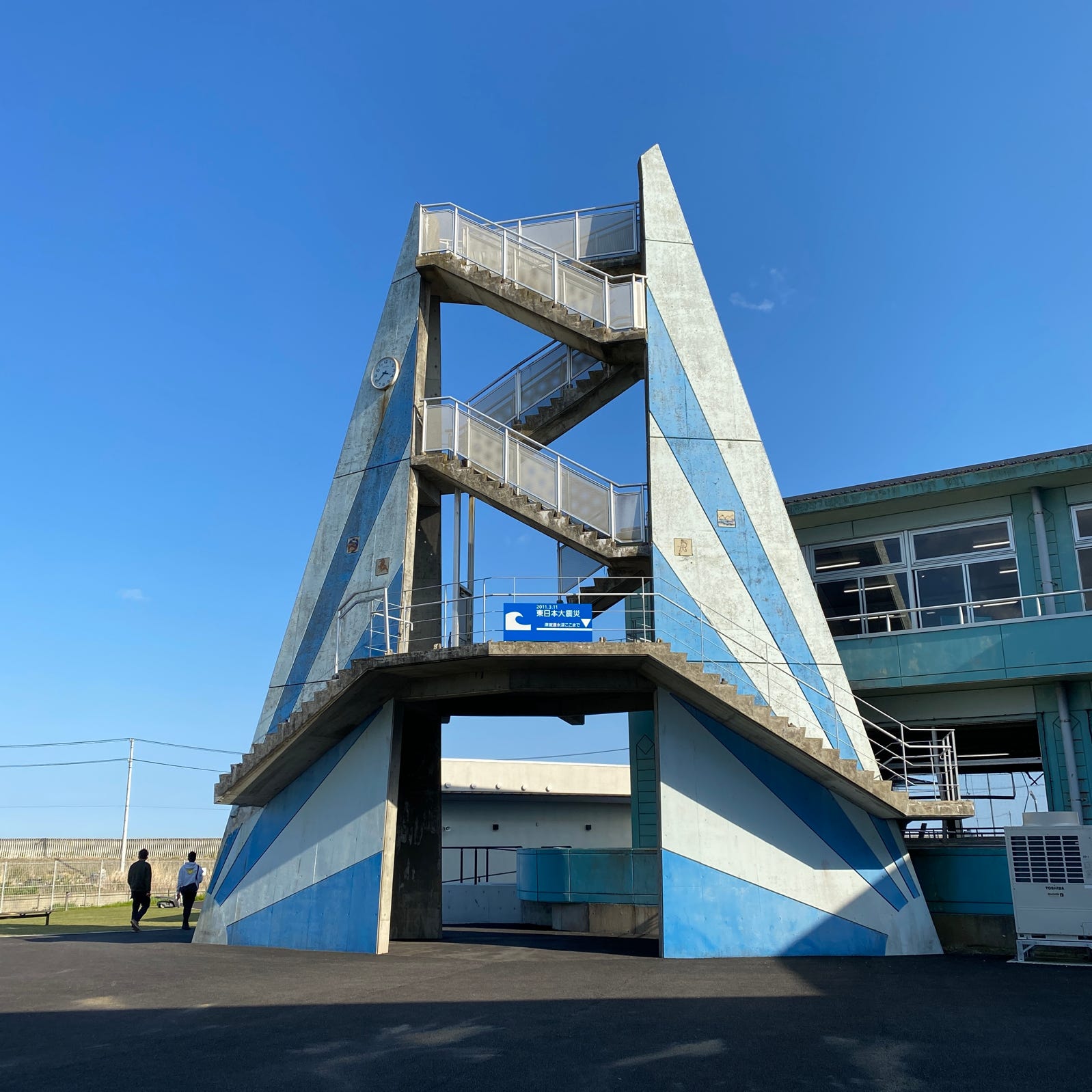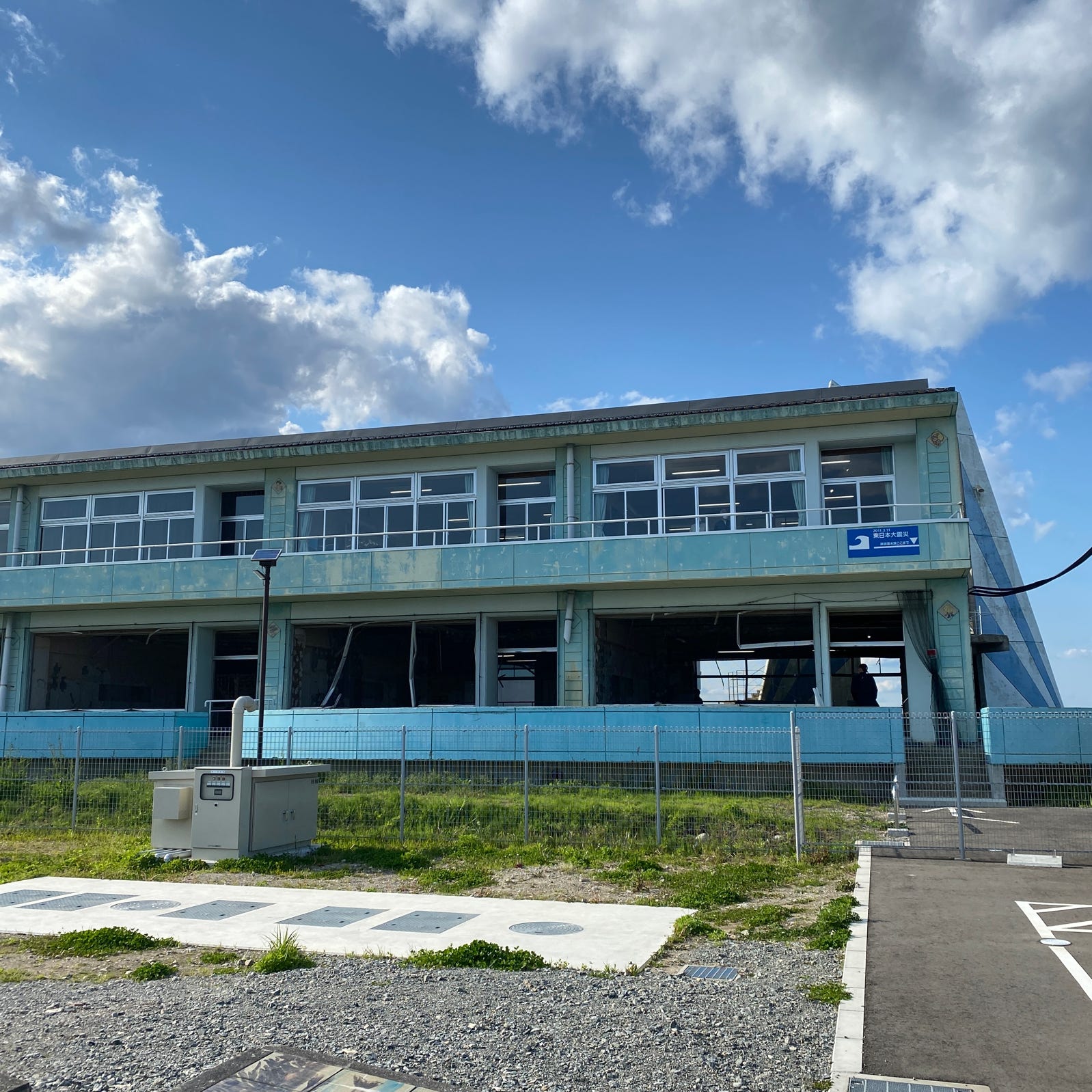 請戸小学校は福島県で唯一の震災遺構。更地になり雑草が生える海岸線の土地にポツンと残されている。こちらは津波の被害をそのまま残しており、"デザイン"の介在する余地が少ない事実としての風景が訪れる人の心を刺す。幸いにもこちらの小学校では被害者が出ることなく全員無事に避難できたということだが、浪江町での学校生活が不可能になったことに変わりはない。時を経て新たに浪江町立なみえ創成小学校・中学校が創設されたようだが、ホームページを見る限り生徒数はまだかなり少ないようだ。