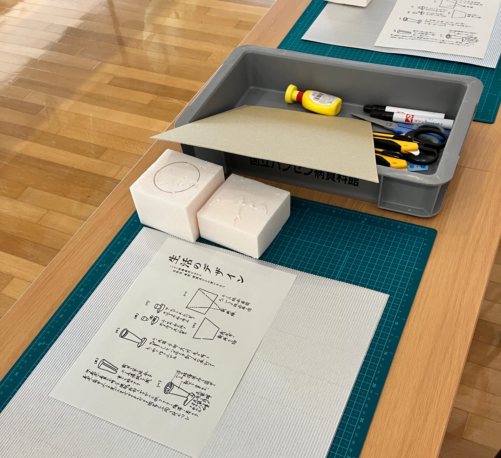 (写真2)ワークショップでは「ブリキの義足」の試作を体験しました。松の木はスタイルフォームで、ブリキはアルミ色の厚紙で、より簡易的で加工のしやすい素材に置き換えて、その構造を理解する趣向になっています。