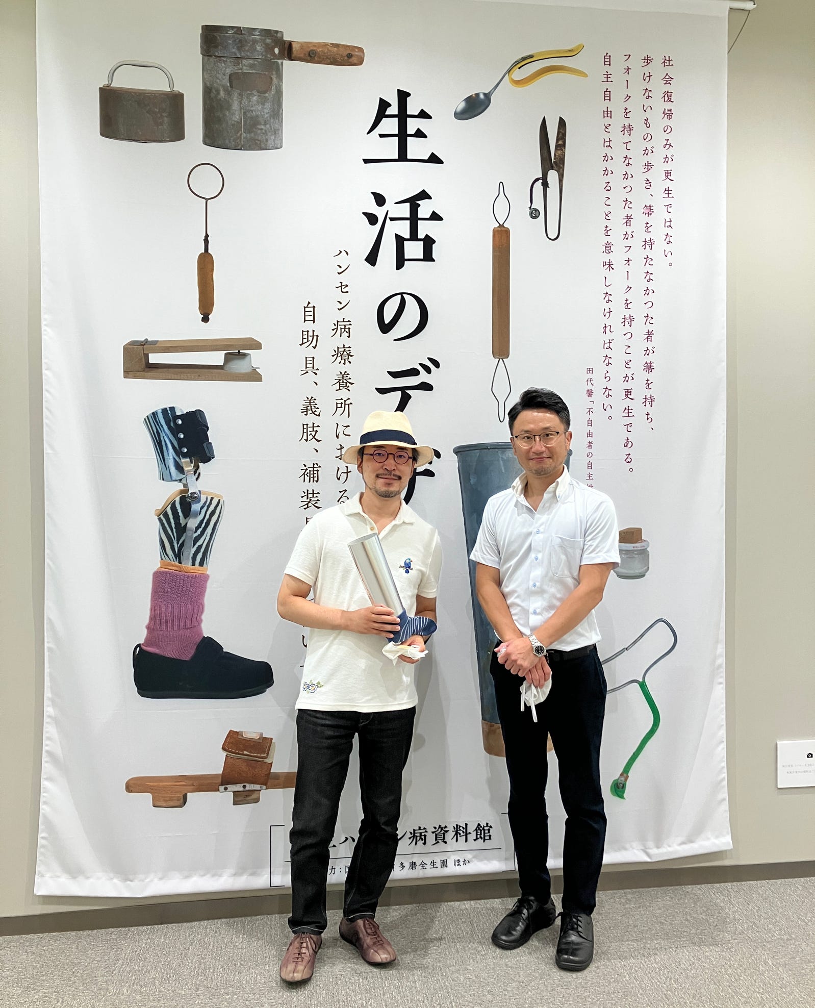 (写真4)企画展のバナーの前にて、国立療養所多磨全生園義肢装具士、後藤直生さん(右)と筆者。現場での貴重なお話をお聞かせくださいました。